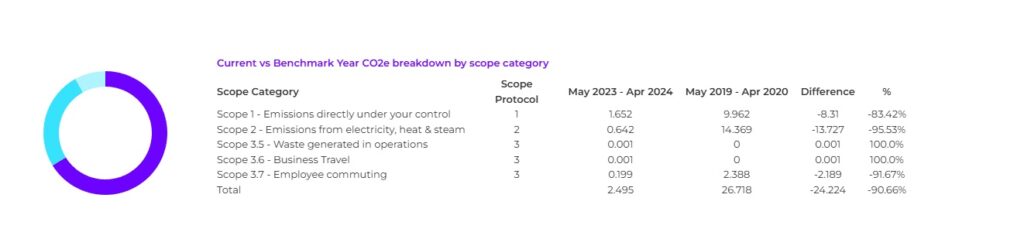 > Reduction in Scope 1 and 2 carbon emissions of 99.6% (22.9tns CO2e per annum)